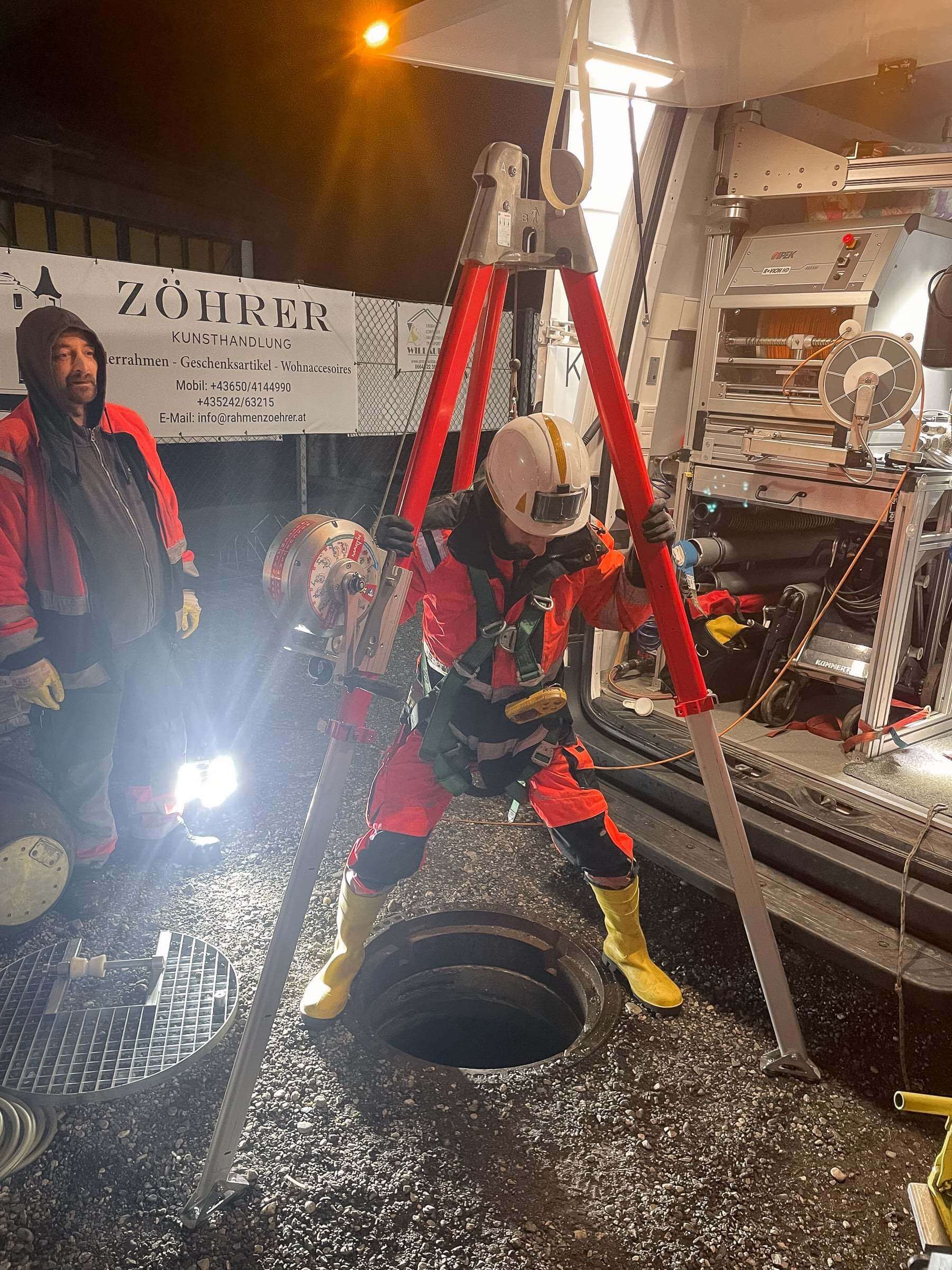 Technisch ging’s auch in Innsbruck weiter: Hier wurde ein defekter Hausanschluss per Schlauchliner saniert – ganz ohne Grabarbeiten, aber mit vollem Einsatz. Schnell, sauber und grabenlos – so geht moderne Sanierung.