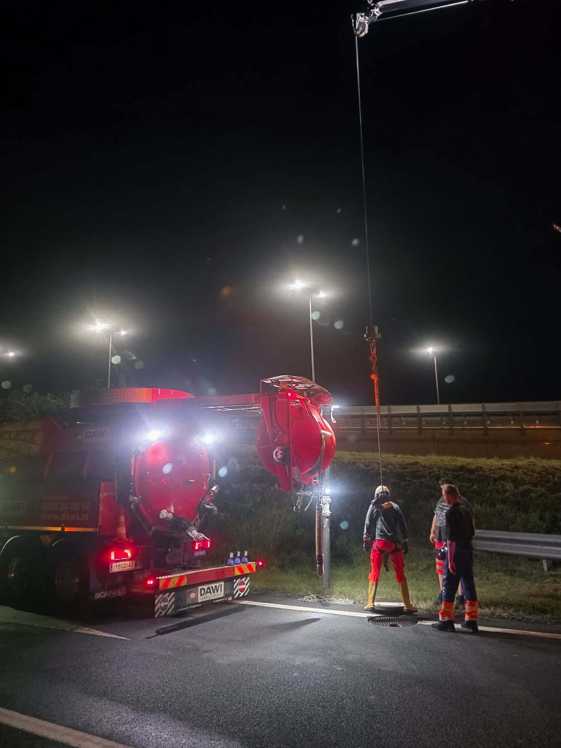 Ein besonders tiefer Schacht ohne Steighilfen? Für unsere Crew kein Problem. Mit dem richtigen Equipment und allen Vorschriften im Blick erledigen wir solche Einsätze sicher. Selbst wenn es mal aussieht wie “Hangman”, bleibt DAWI immer regelkonform!